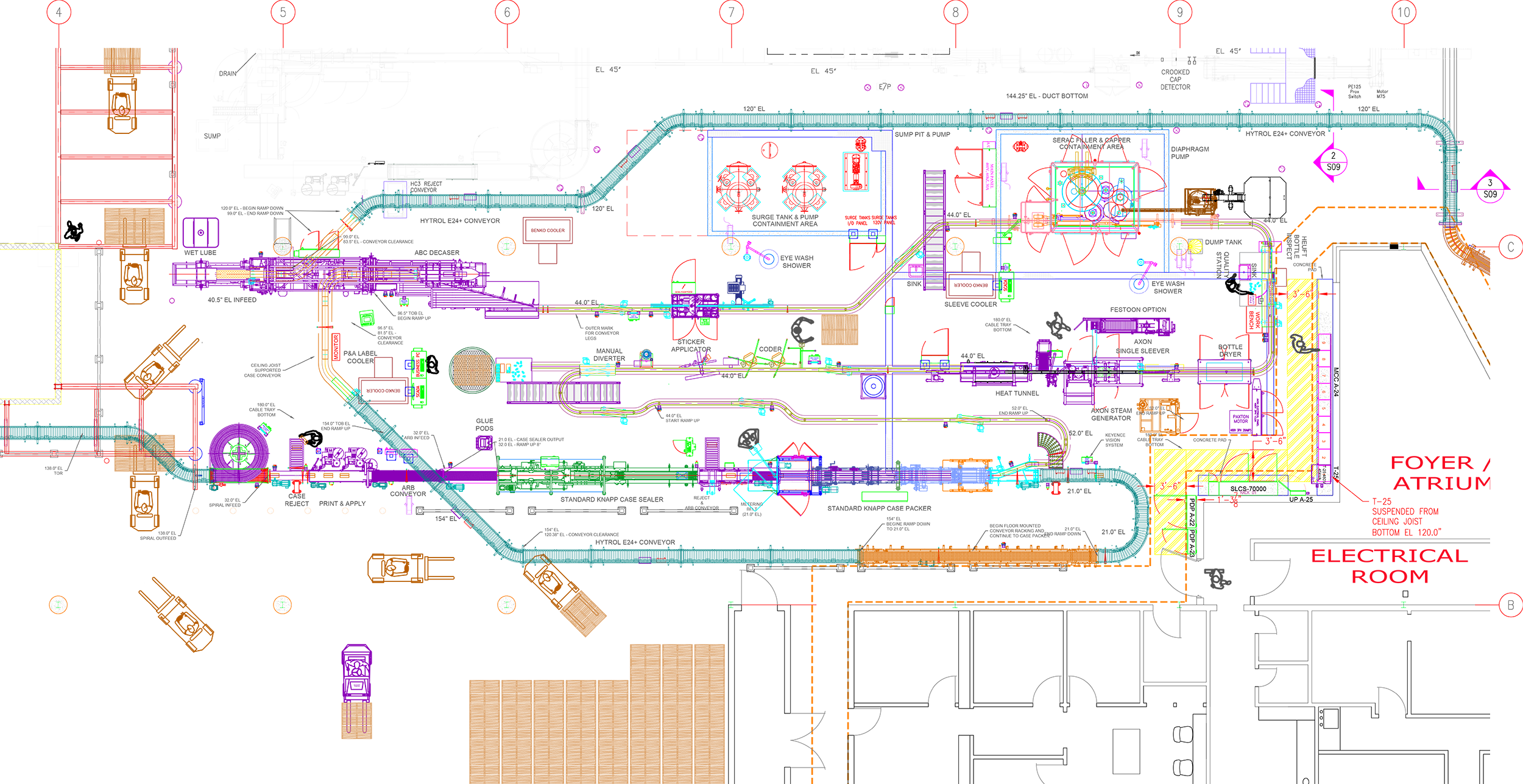 Design and Installation of new 120bpm packaging line for cleaning products. System includes new filler, capper, sleever, case packer, and conveying system. The system feeds into a repurposed palletizer. Designed and installed a new product delivery system from the process to the filler. Project included new switch gear for power feed to power distribution panel, new 9 section MCC, new ControlLogix control panel (fabricated at TA panel shop) and Factory Talk operator stations.
